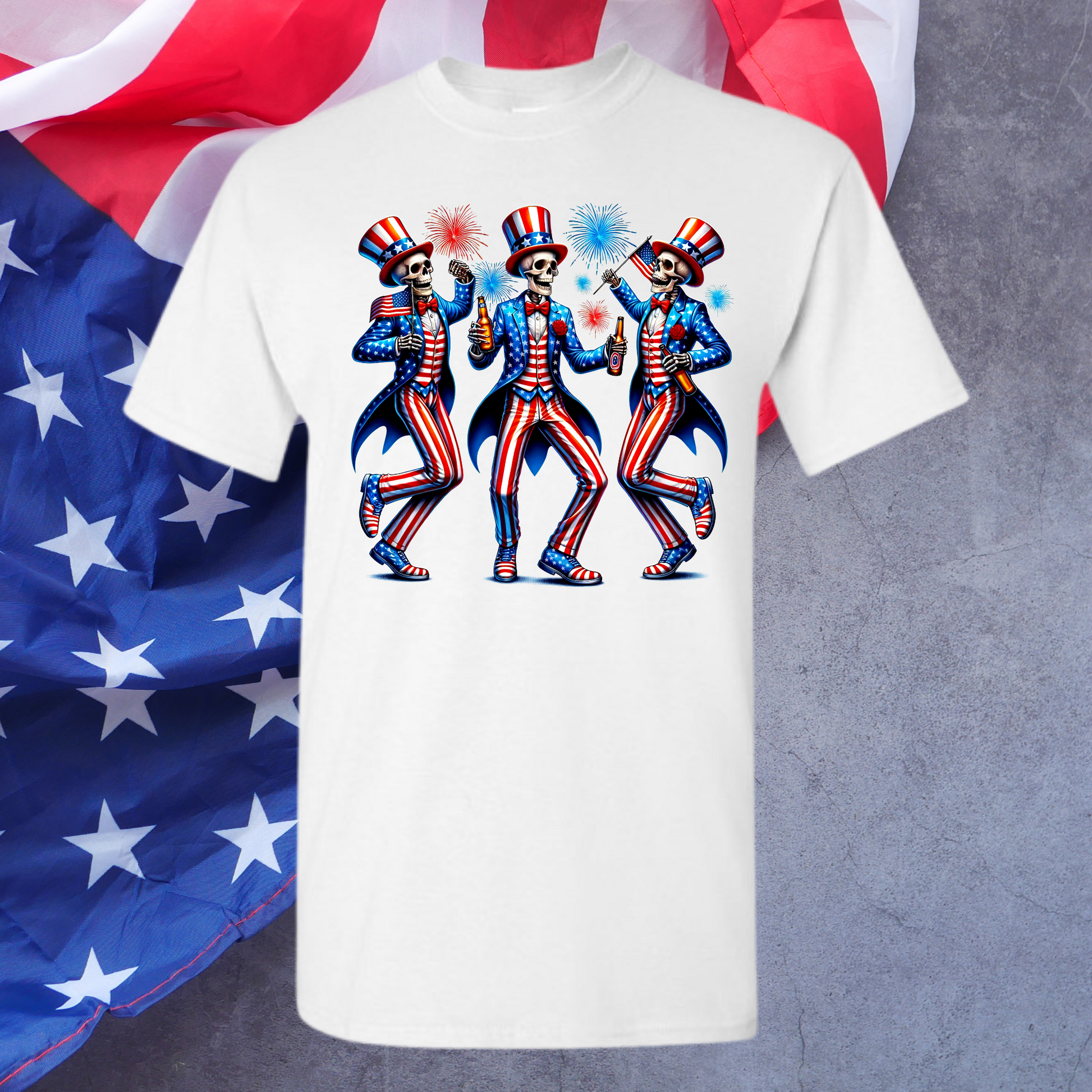 Add a touch of humor to your celebration with the American Skeleton Tee. Made from 100% preshrunk cotton, this lightweight shirt offers lasting comfort and a perfect fit. Its playful design makes it a fun and memorable choice for showing your patriotic spirit with a smile.