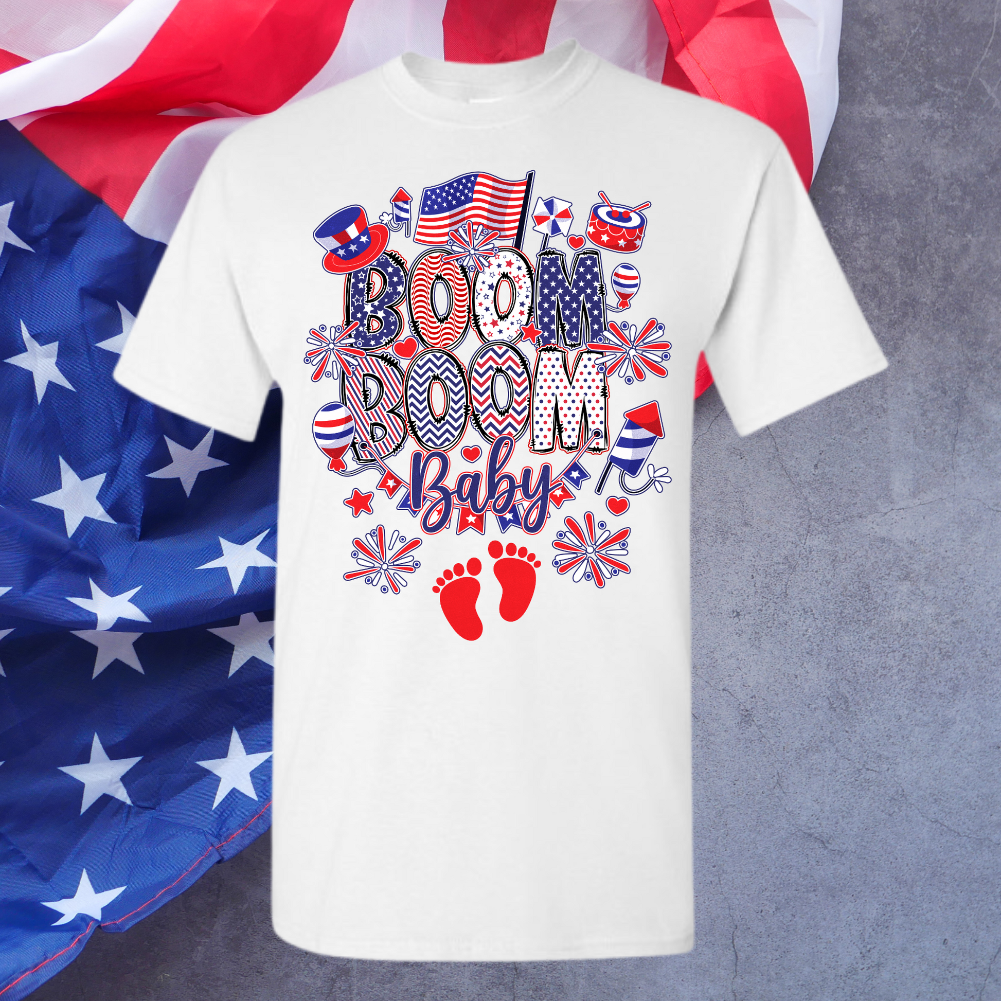 Show your American pride in comfort with the Boom Boom Baby tee. Crafted from 100% lightweight, breathable cotton, this shirt is perfect for moms-to-be who want to celebrate in style. Its soft fabric ensures all-day comfort while highlighting your patriotic spirit with ease
