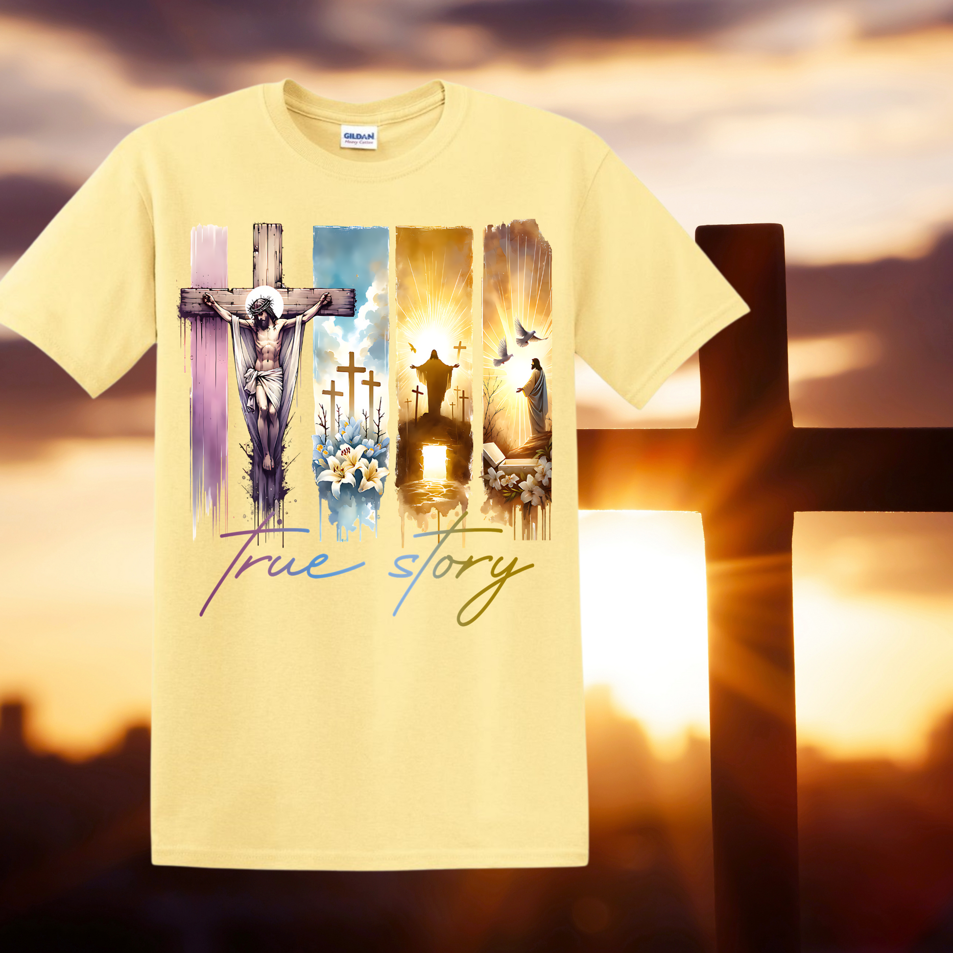 Unleash your inner storyteller with the True Story Tee! This tee lets you celebrate the resurrection with its unique design, perfect for anyone who wants to spread the good news in a memorable way.